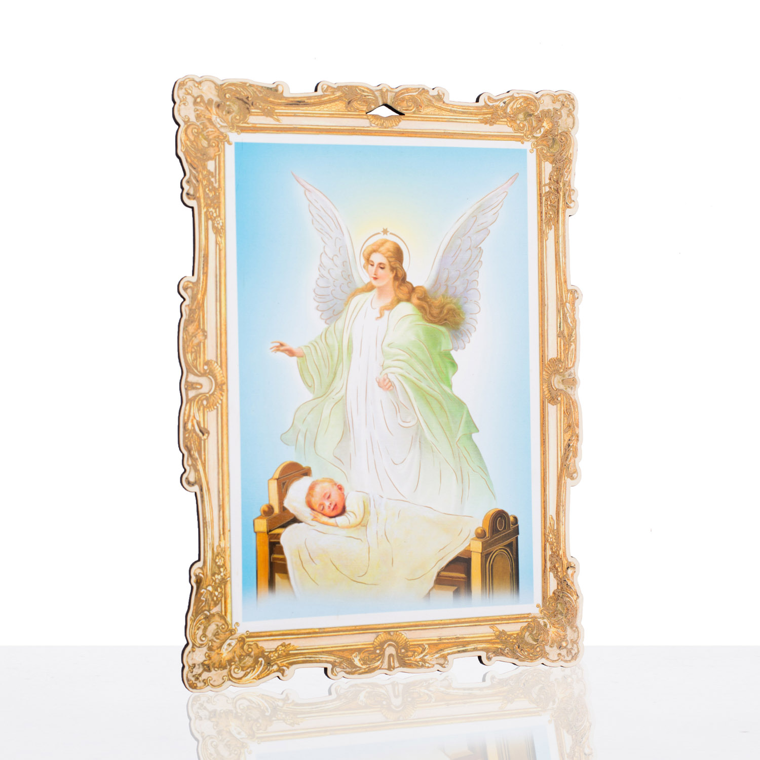 Wyjątkowej jakości drewniany obrazek z wizerunkiem Anioła Stróża. Kolory i grafika artykułu subtelnie podkreślają każdy szczegół postaci. Produkt wykonany z wysokiej jakości materiału drewnopochodnego, którego solidna forma urzeknie każdego. Obrazek święty Anioł Stróż charakteryzuje się wspaniałym złoceniem, które akcentuje poszczególne detale kompozycji. Powyższy produkt sprawdzi się jako miły upominek, który w subtelny sposób zaakcentuje wiarę. Możliwość wykonania na odwrocie dedykacji sprawia, że produkt staje się wyjątkowym podarunkiem na uroczystość.