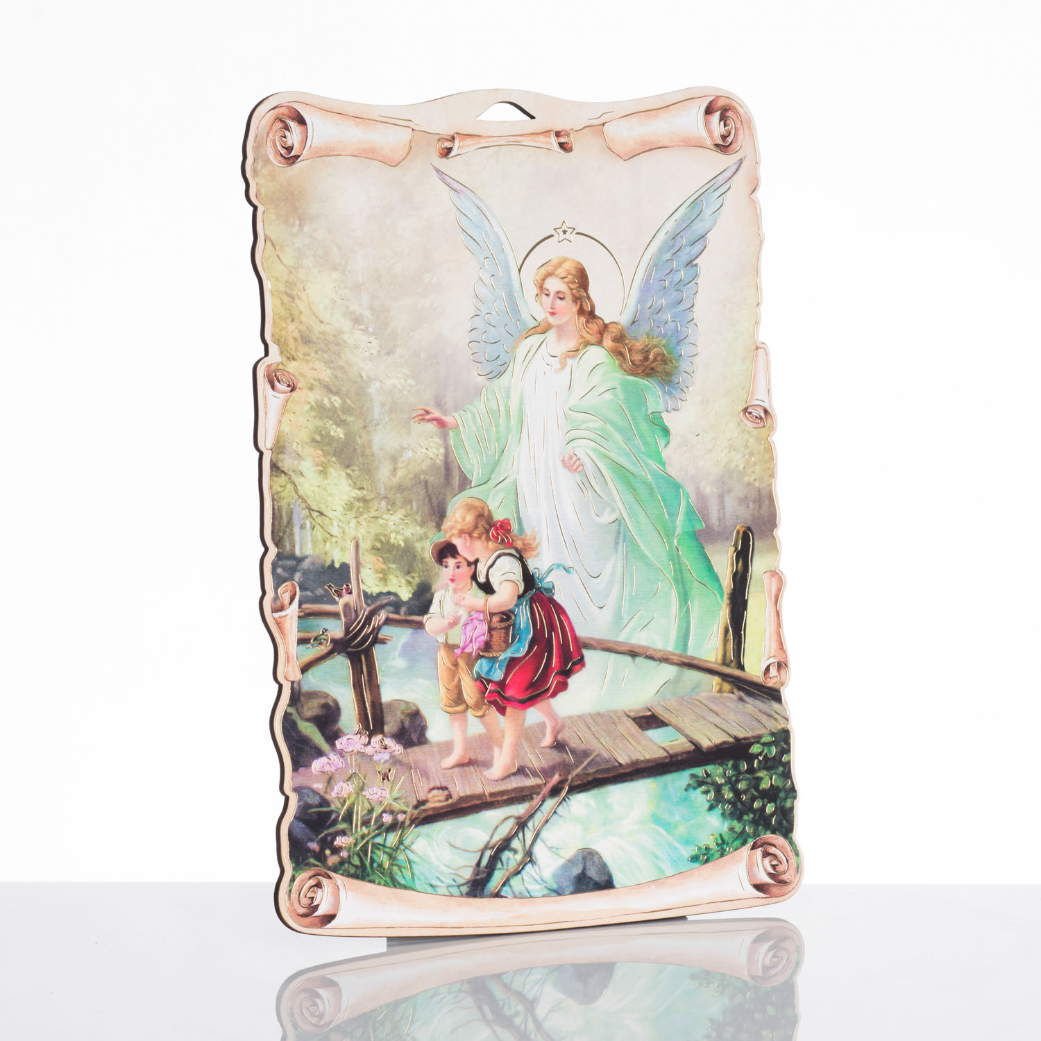 Wyjątkowej jakości drewniany obrazek z wizerunkiem Anioła Stróża. Kolory i grafika artykułu subtelnie podkreślają każdy szczegół postaci. Produkt wykonany z wysokiej jakości materiału drewnopochodnego, którego solidna forma urzeknie każdego. Obrazek święty Anioł Stróż charakteryzuje się wspaniałym złoceniem, które akcentuje poszczególne detale kompozycji. Powyższy produkt sprawdzi się jako miły upominek, który w subtelny sposób zaakcentuje wiarę. Możliwość wykonania na odwrocie dedykacji sprawia, że produkt staje się wyjątkowym podarunkiem na uroczystość.