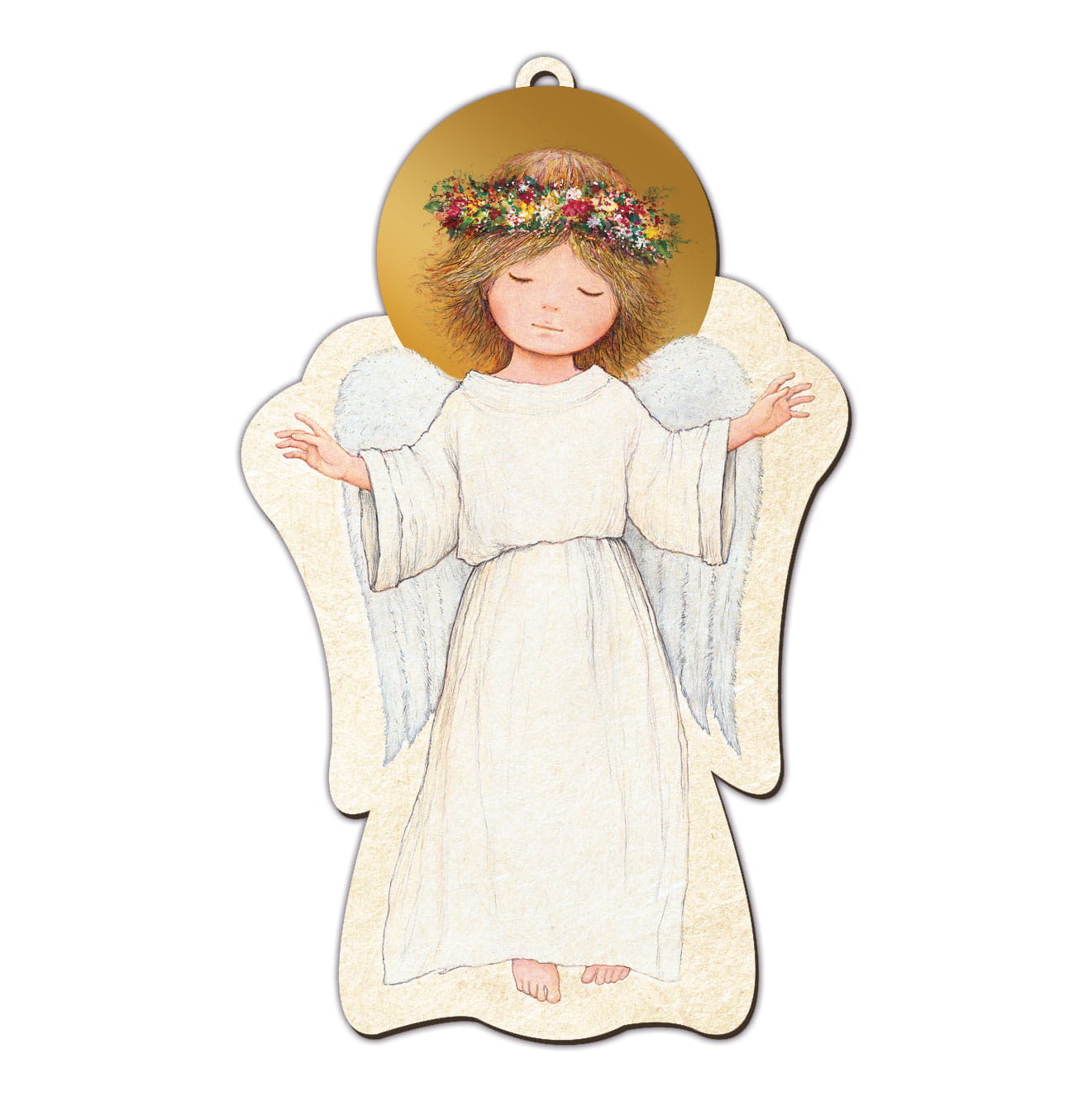 Obrazek drewniany w kształcie aniołka. Produkt charakteryzuje się wyjątkową grafiką. Jest to idealna forma upominku z okazji uroczystości Pierwszej Komunii Świętej, Chrztu Świętego.