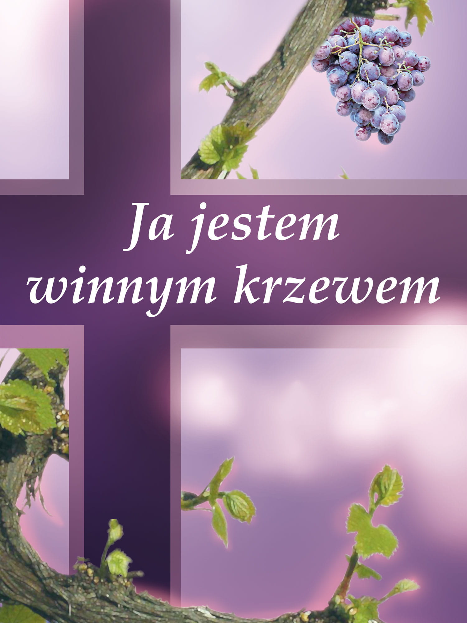 W tle grafiki widnieje krzew winny z zarysem krzyża. Na banerze znajduje się napis "Ja jestem winnym krzewem". Wyraźne kolory, grafika i napis sprawiają, że produkt prezentuje się wspaniale, jest widoczny nawet z dalekiej odległości.