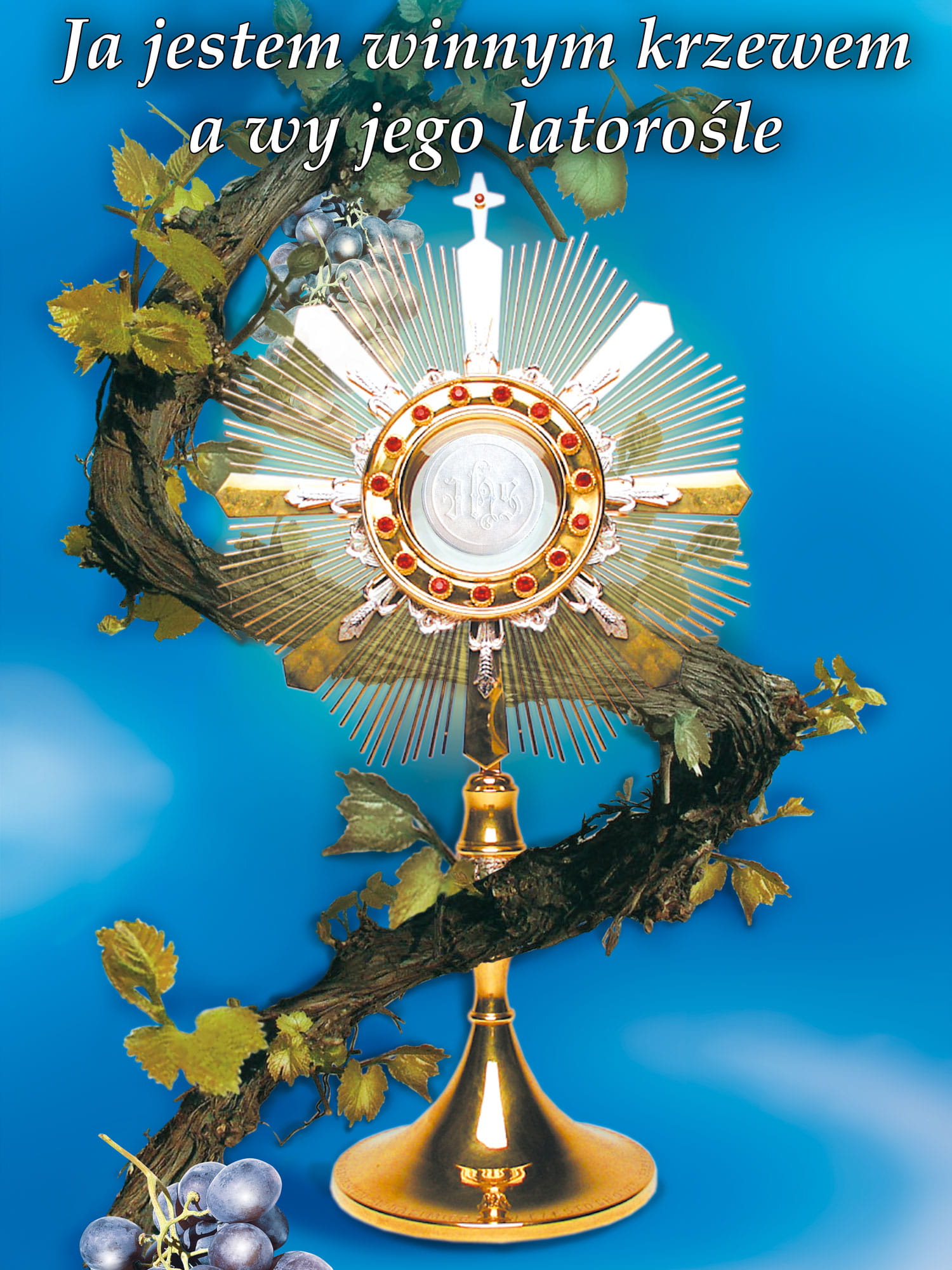 Baner na Boże Ciało, "Ja jestem winnym krzewem..." błękitny z Hostią