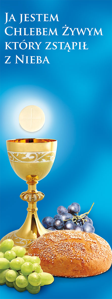 Baner w jasnych barwach, na górze umieszczony jest napis "Jestem chlebem żywym który zstąpił z nieba". Na środku znajduje się Kielich mszalny z Hostią, chleb wraz z kiśćmi winogron.Wyraźne kolory,grafika i napis sprawiają, że produkt prezentuje się wspaniale, jest widoczny nawet z dalekiej odległości.