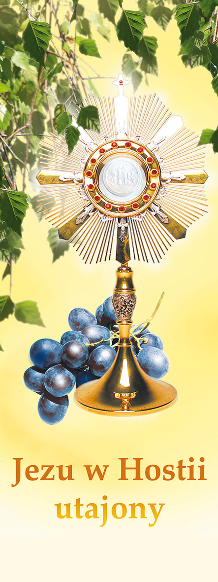 Baner w jasnych barwach, na dole umieszczony jest napis "Jezu w Hostii utajony". Na środku znajduje się Hostia wraz z kiśćmi winogron. Wyraźne kolory,grafika i napis sprawiają, że produkt prezentuje się wspaniale, jest widoczny nawet z dalekiej odległości.