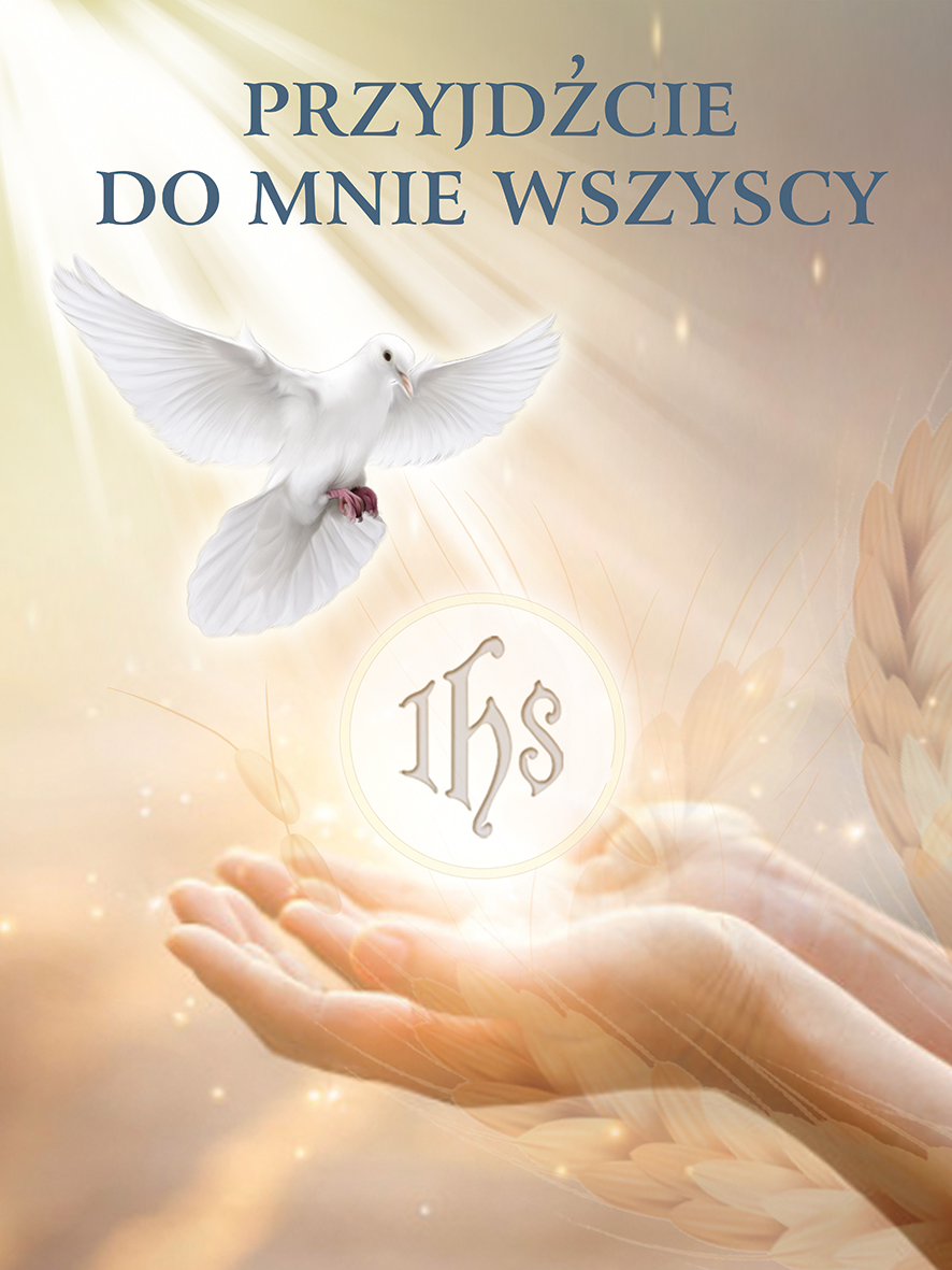 Baner cechuje się jasnym odcieniem. Na środku produktu znajduje się Duch Święty oraz rozłożone ręce z Hostią. Na górze widnieje napis "Przyjdźcie do mnie wszyscy". Wyraźne kolory i grafika sprawiają, że produkt prezentuje się wspaniale, jest widoczny nawet z dalekiej odległości.