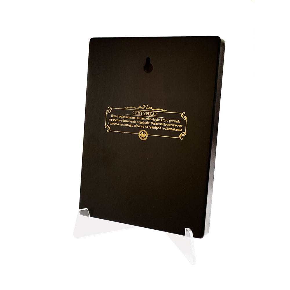 Produkt wykonany na starannie przygotowanej desce olchowej. Wizerunek znajdujący się na ikonie to wydruk na złotym kartonie dodatkowo zabezpieczony lakierem UV. Ikona religijna w wersji klejonej to doskonały wybór dla klientów ceniących wysoką jakość w atrakcyjnej cenie. Produkt wykonany z najwyższą starannością i dbałością o szczegóły. Każda ikona zapakowana w estetyczne pudełko. Produkt wspaniale sprawdzi się jak upominek dla bliskiej osoby.