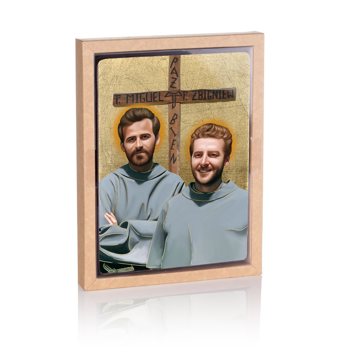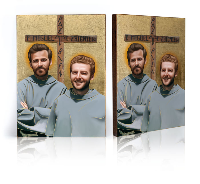 Ikona religijna przedstawia wizerunek Błogosławionych Zbigniewa Strzałkowskiego i Michała Tomaszka. Wszystkie ikony dostępne w naszej ofercie wykonane są z najwyższej jakości materiałów. Drewno wykorzystywane do produkcji ikon dobierane jest w niezwykle staranny sposób. Wizerunek naniesiony na ręcznie złoconą deskę. Produkt wspaniale sprawdzi się jako jedyny w swoim rodzaju upominek dla najbliższych.