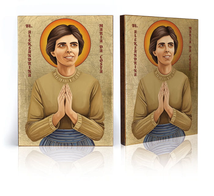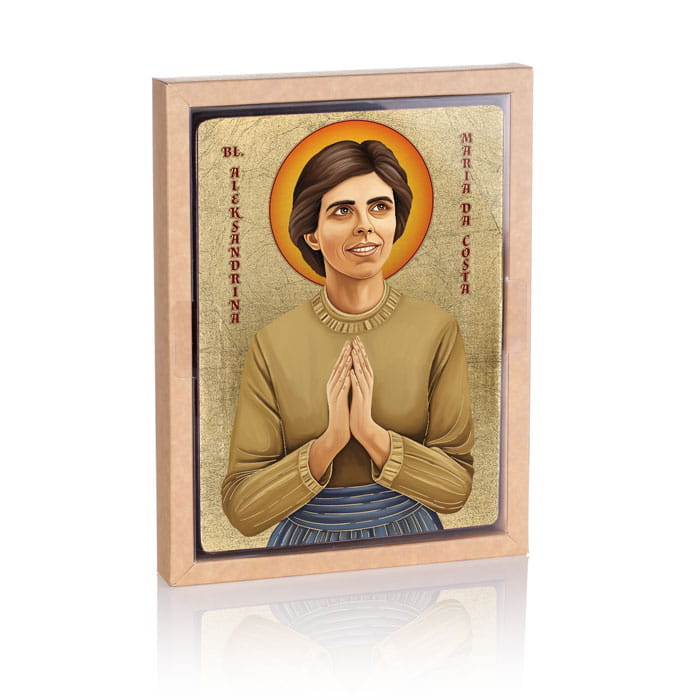Na ikonie znajduje się wizerunek Błogosławionej Aleksandriny od Balazar, portugalska mistyczka i świecka salezjanka współpracownica. Wszystkie ikony dostępne w naszej ofercie wykonane są z najwyższej jakości materiałów. Drewno wykorzystywane do produkcji ikon dobierane jest w niezwykle staranny sposób. Wizerunek naniesiony na ręcznie złoconą deskę. Produkt wspaniale sprawdzi się jako jedyny w swoim rodzaju upominek dla najbliższych.