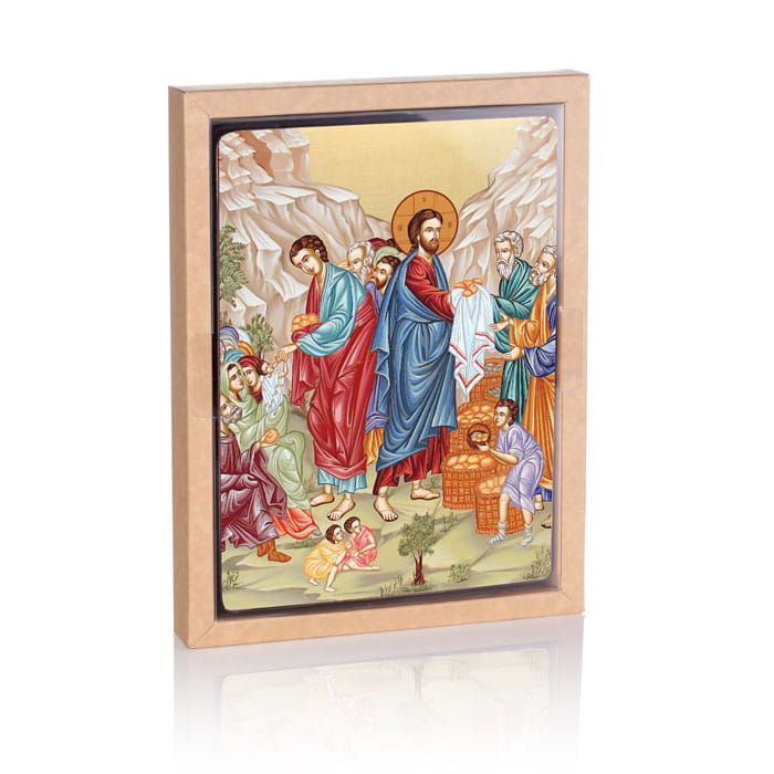 Na ikonie znajduje się scena cudownego rozmnożenia chleba przez Jezusa Chrystusa. Wszystkie ikony dostępne w naszej ofercie wykonane są z najwyższej jakości materiałów. Drewno wykorzystywane do produkcji ikon dobierane jest w niezwykle staranny sposób. Wizerunek naniesiony na ręcznie złoconą deskę. Produkt wspaniale sprawdzi się jako jedyny w swoim rodzaju upominek dla najbliższych.