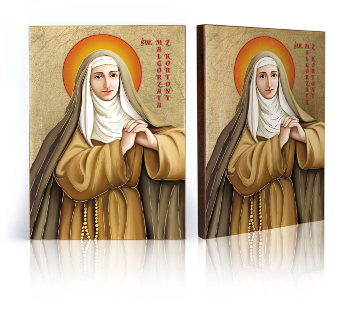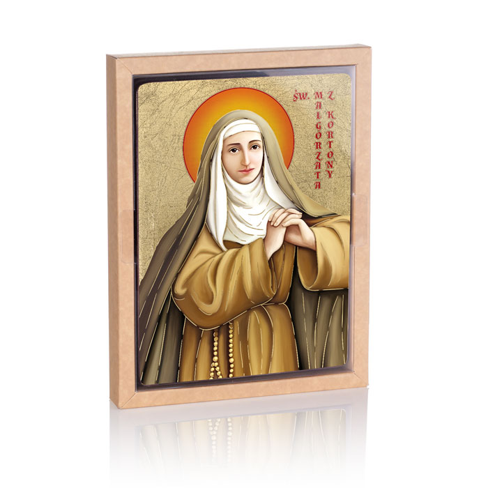 Ikona religijna przedstawia wizerunek Świętej Małgorzaty z Kortony. Wszystkie ikony dostępne w naszej ofercie wykonane są z najwyższej jakości materiałów. Drewno wykorzystywane do produkcji ikon dobierane jest w niezwykle staranny sposób. Wizerunek naniesiony na ręcznie złoconą deskę. Produkt wspaniale sprawdzi się jako jedyny w swoim rodzaju upominek dla najbliższych.