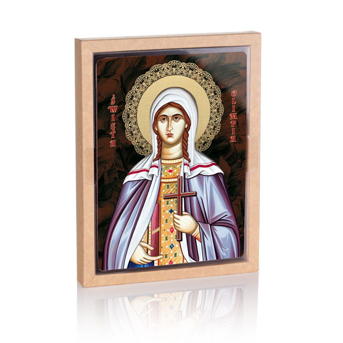 Ikona religijna przedstawia wizerunek Świętej Olimpii. Wszystkie ikony dostępne w naszej ofercie wykonane są z najwyższej jakości materiałów. Drewno wykorzystywane do produkcji ikon dobierane jest w niezwykle staranny sposób. Wizerunek naniesiony na ręcznie złoconą deskę. Produkt wspaniale sprawdzi się jako jedyny w swoim rodzaju upominek dla najbliższych.
