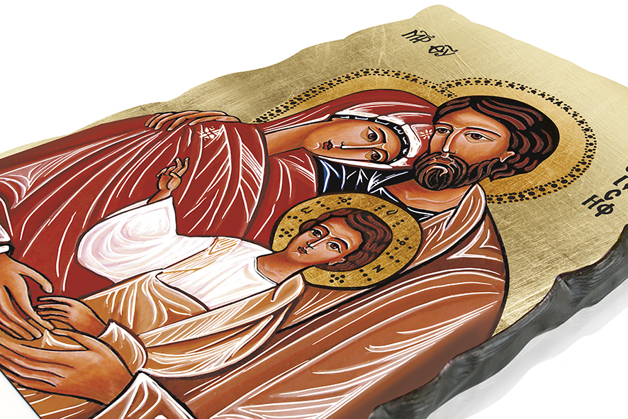Przedstawiamy Państwu serię ikon w nowym stylu! Boki drewnianej deski charakteryzują się niezwykłym i fantazyjnym zdobieniem. Na ikonie widnieje wizerunek Świętej Rodziny.