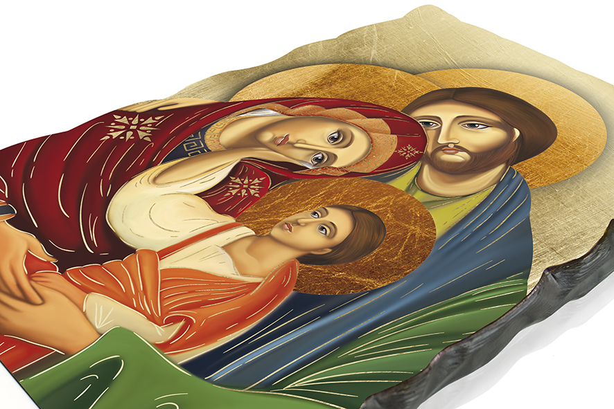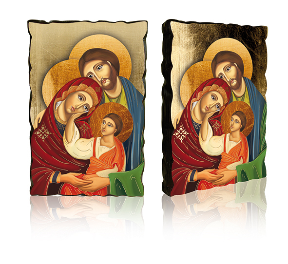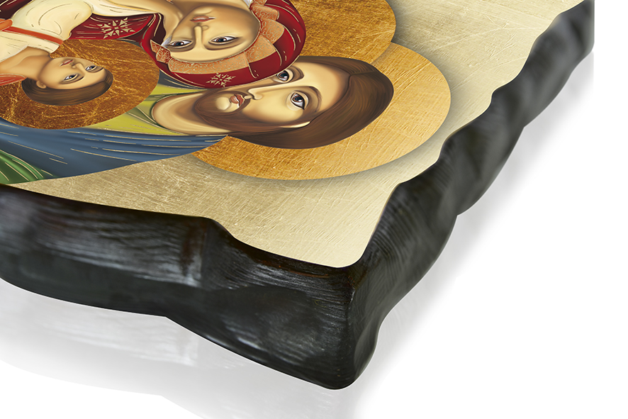 Przedstawiamy Państwu serię ikon w nowym stylu! Boki drewnianej deski charakteryzują się niezwykłym i fantazyjnym zdobieniem. Na ikonie widnieje wizerunek Świętej Rodziny.