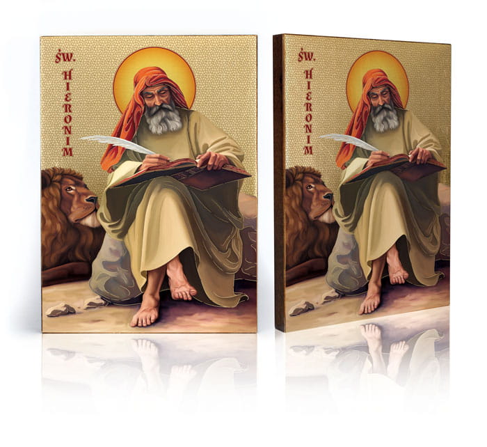 Ikona religijna przedstawia wizerunek Świętego Hieronima. Wszystkie ikony dostępne w naszej ofercie wykonane są z najwyższej jakości materiałów. Drewno wykorzystywane do produkcji ikon dobierane jest w niezwykle staranny sposób. Wizerunek naniesiony na ręcznie złoconą deskę. Produkt wspaniale sprawdzi się jako jedyny w swoim rodzaju upominek dla najbliższych.