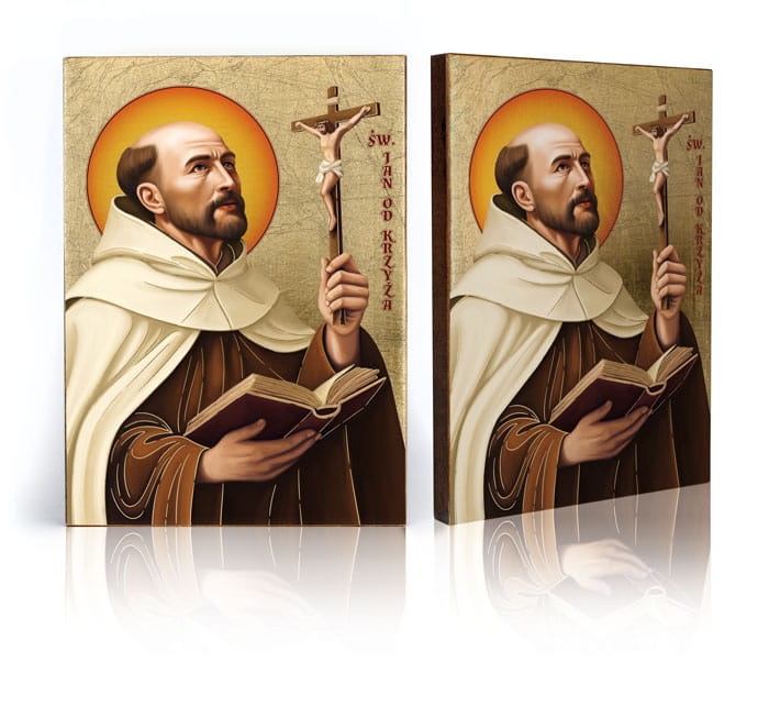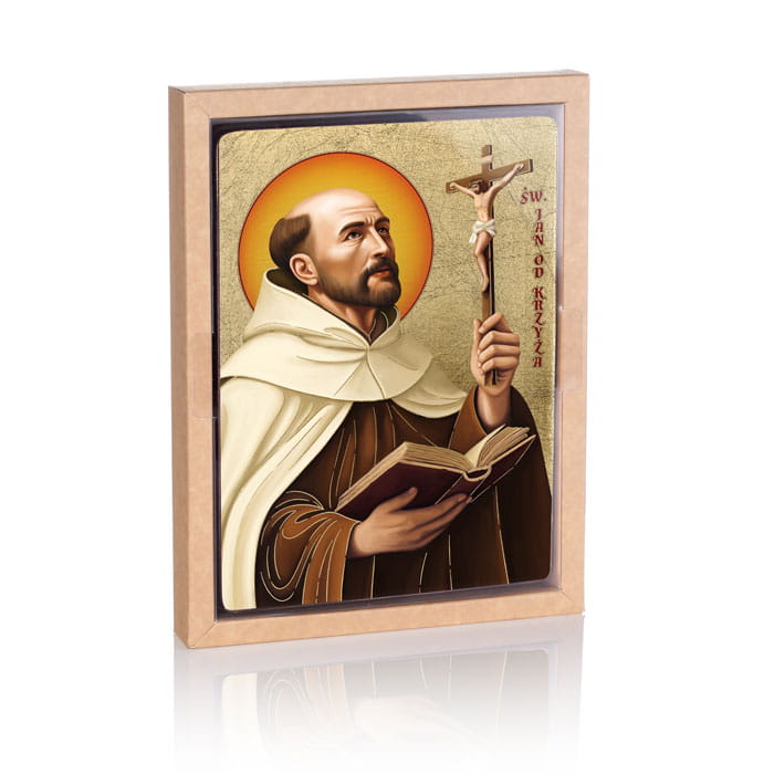 Na ikonie znajduje się wizerunek Świętego Jana od Krzyża. Wszystkie ikony dostępne w naszej ofercie wykonane są z najwyższej jakości materiałów. Drewno wykorzystywane do produkcji ikon dobierane jest w niezwykle staranny sposób. Wizerunek naniesiony na ręcznie złoconą deskę. Produkt wspaniale sprawdzi się jako jedyny w swoim rodzaju upominek dla najbliższych.