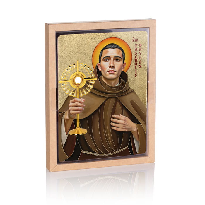 Na ikonie znajduje się wizerunek Świętego Paschalisa Baylona, nazywanego doktorem eucharystii. Wszystkie ikony dostępne w naszej ofercie wykonane są z najwyższej jakości materiałów. Drewno wykorzystywane do produkcji ikon dobierane jest w niezwykle staranny sposób. Wizerunek naniesiony na ręcznie złoconą deskę. Produkt wspaniale sprawdzi się jako jedyny w swoim rodzaju upominek dla najbliższych.