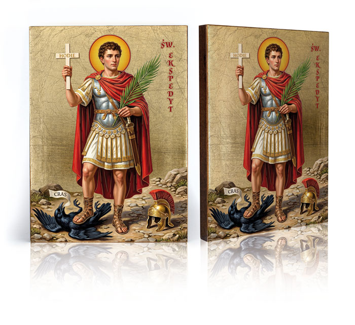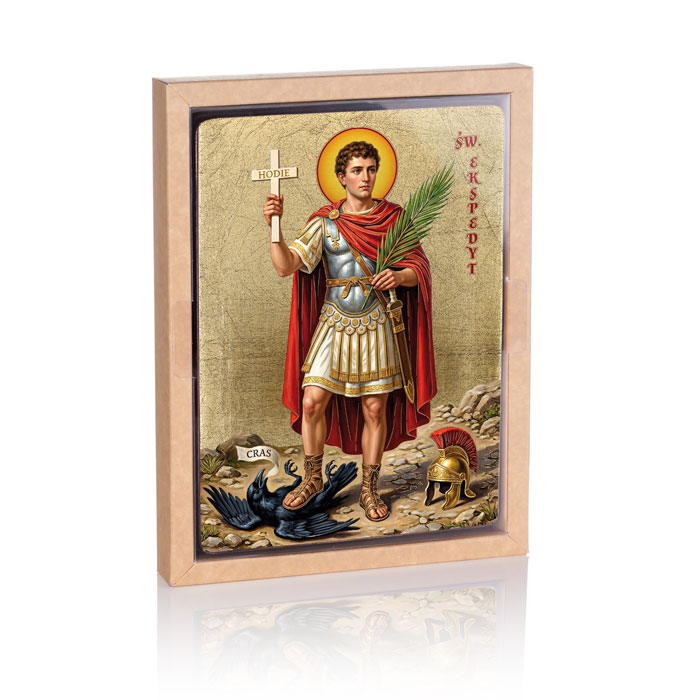 Ikona religijna przedstawia wizerunek Świętego Ekspedyta. Wszystkie ikony dostępne w naszej ofercie wykonane są z najwyższej jakości materiałów. Drewno wykorzystywane do produkcji ikon dobierane jest w niezwykle staranny sposób. Wizerunek naniesiony na ręcznie złoconą deskę. Produkt wspaniale sprawdzi się jako jedyny w swoim rodzaju upominek dla najbliższych.