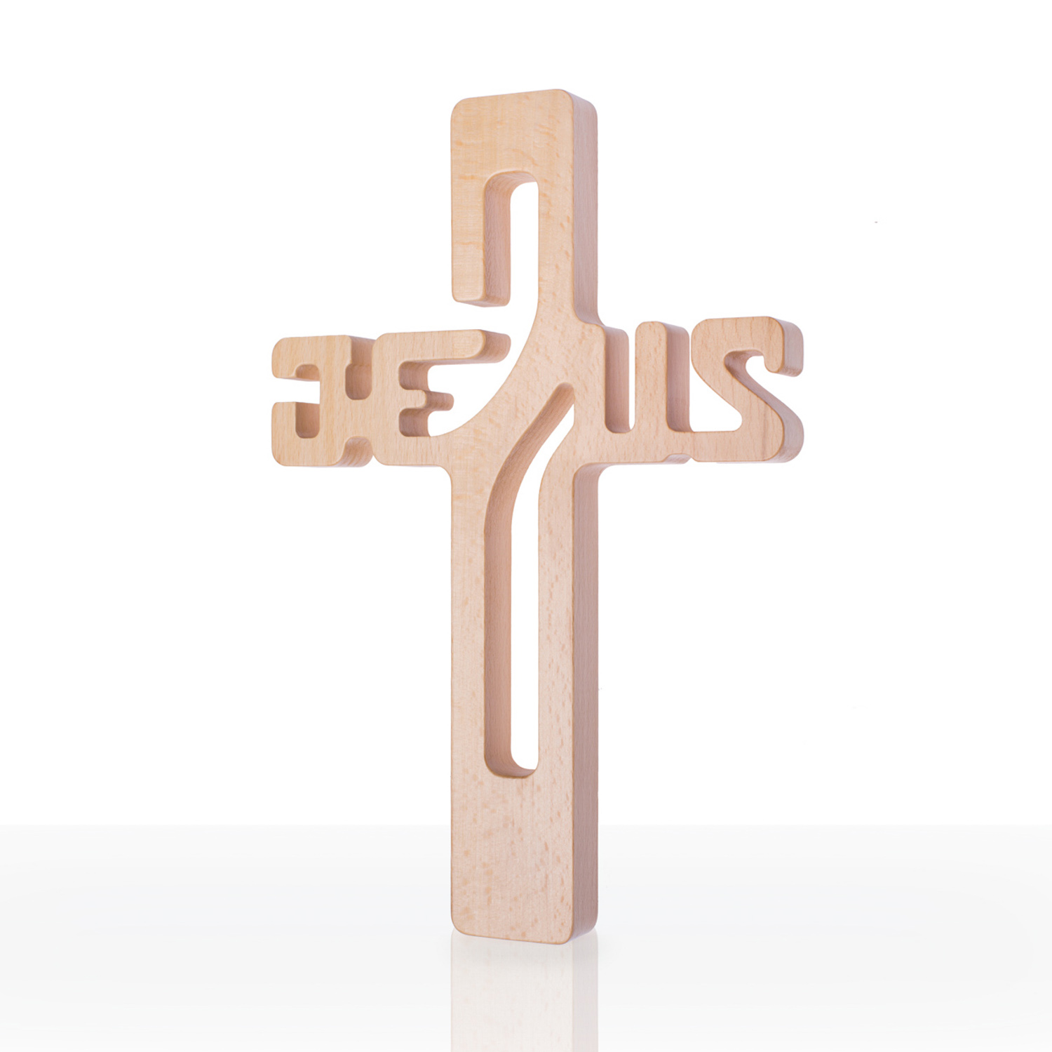 Solidny krzyż wykonany z wysokiej jakości drewna. Zaokrąglone krawędzie produktu sprawiają, że bardzo dobrze układa się on w dłoni i jest bardzo przyjemny w dotyku. Powierzchnia zabezpieczona bezbarwnym lakierem, dzięki czemu krzyż przez długi czas pozostaje w nienagannym stanie.Z przodu krzyża znajduje się napis " JEZUS". Produkt dostosowany do powieszenia - z tyłu krzyża znajduje się otwór umożliwiający zawieszenie.