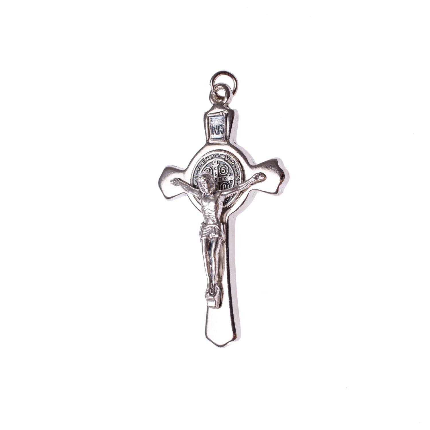 Solidny krzyż wykonany z wysokiej jakości niklu. Wyprofilowane krawędzie produktu sprawiają, że bardzo dobrze układa się on w dłoni i jest bardzo przyjemny w dotyku. Na środku krzyża znajduje się metalowy Korpus Jezusa Chrystusa oraz medalion Św. Benedykta. Produkt dostosowany do powieszenia.