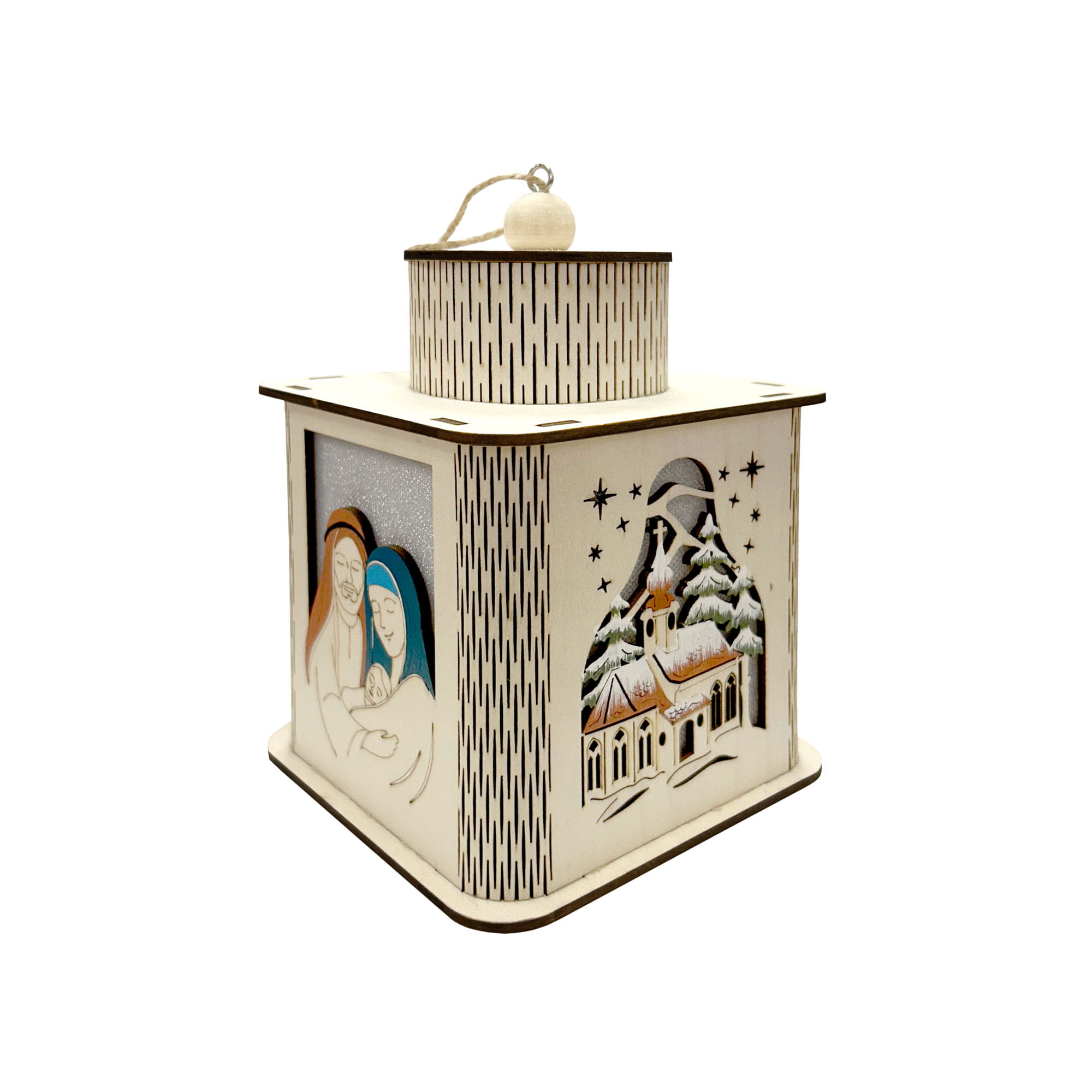 Oryginalny lampion adwentowy z podświetleniem LED, wykonany z wysokiej jakości naturalnej sklejki. Zdobiony precyzyjnymi wycięciami przedstawiającymi Scenę Narodzenia Pańskiego – Świętą Rodzinę, Trzech Króli oraz pasterzy.