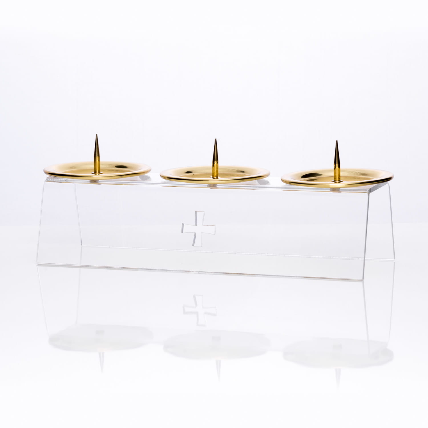 Lichtarz potrójny wykonany z pleksi z mosiężnym talerzykiem oraz grotem. Na jednym z boków widnieje wycięty krzyż.