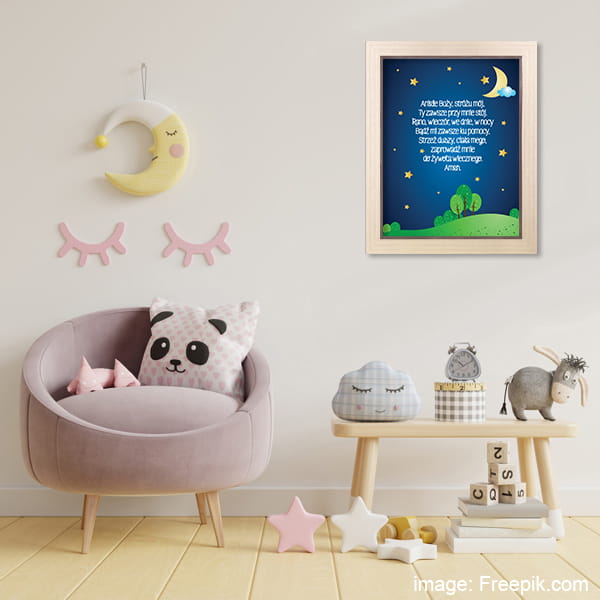 Obrazek wspaniale będzie prezentował się nad łóżeczkiem malucha. Możliwość doboru odpowiedniej formy oprawy sprawia, że produkt może być idealnie dopasowany do danego wnętrza.