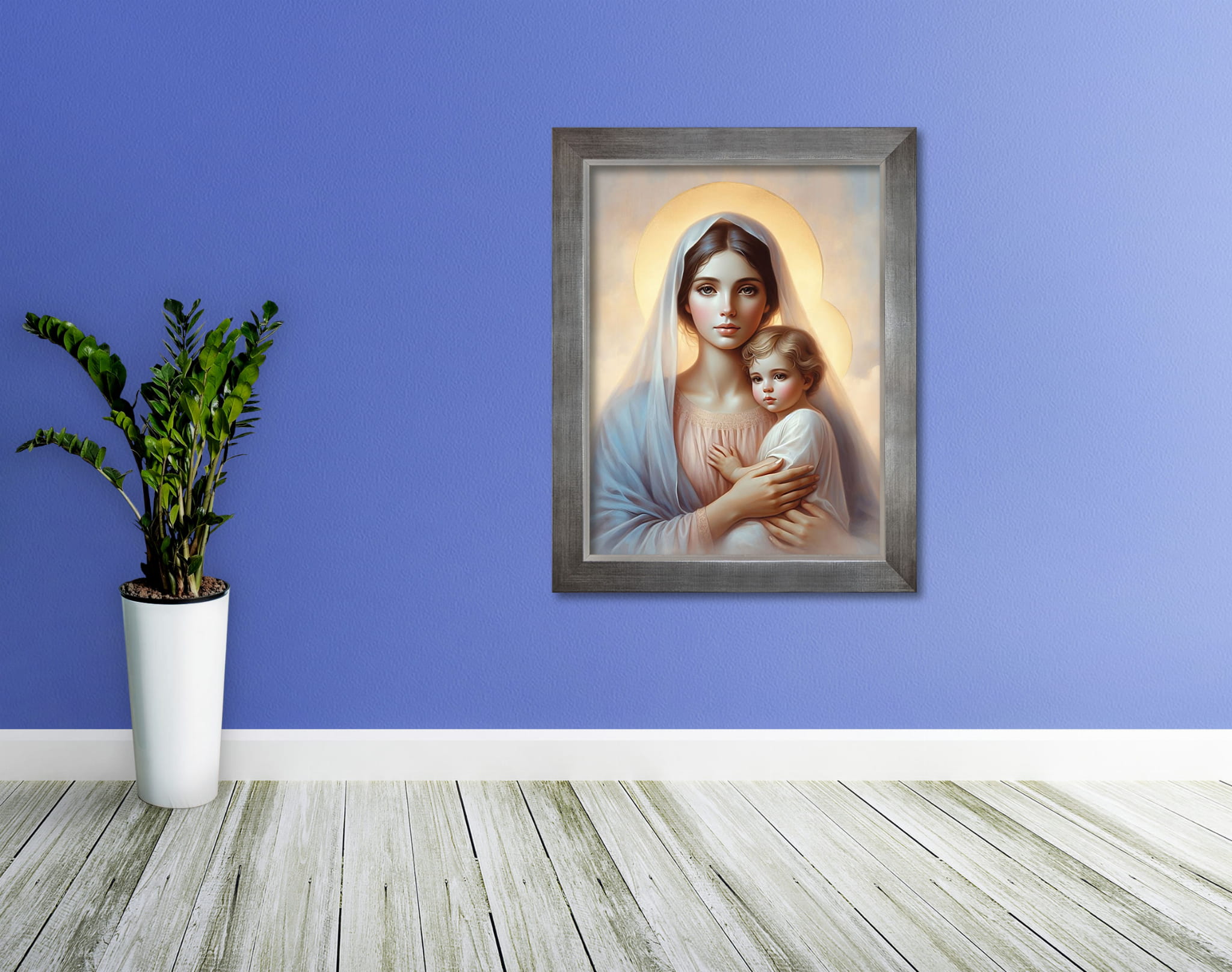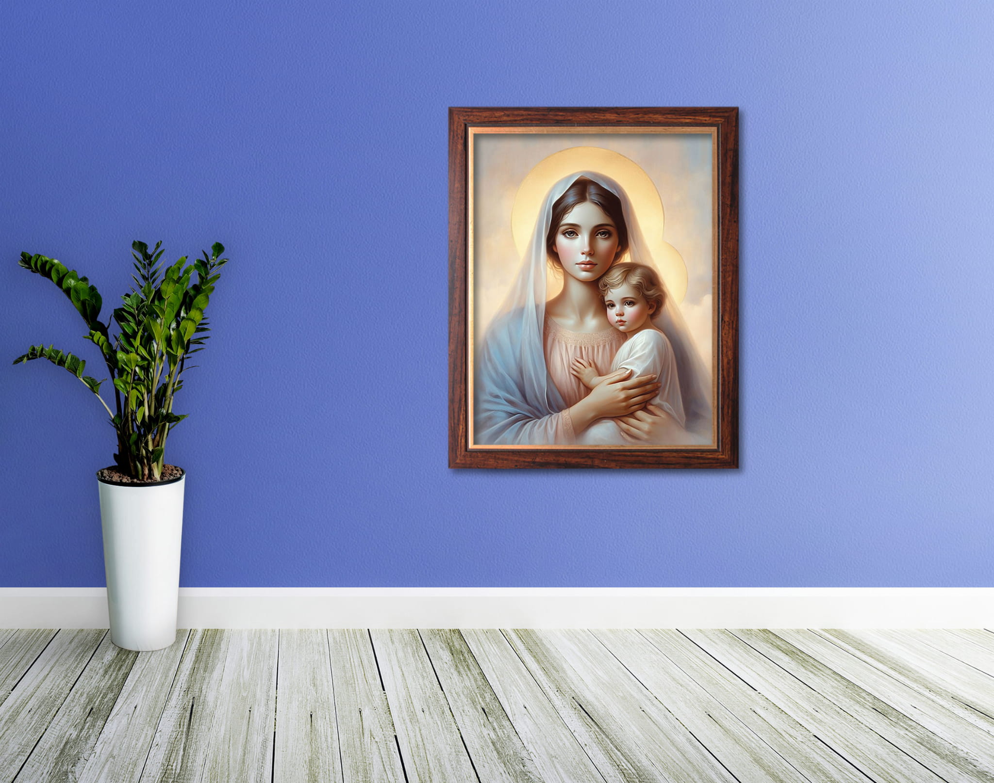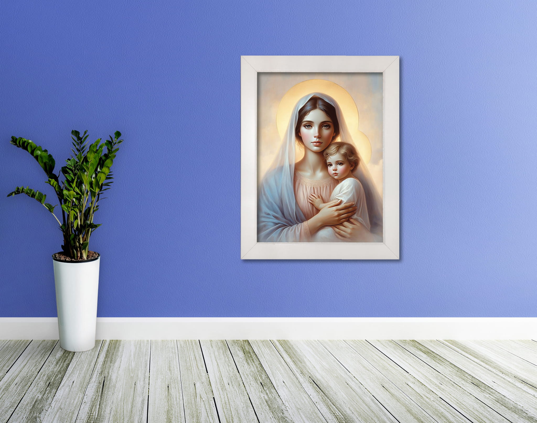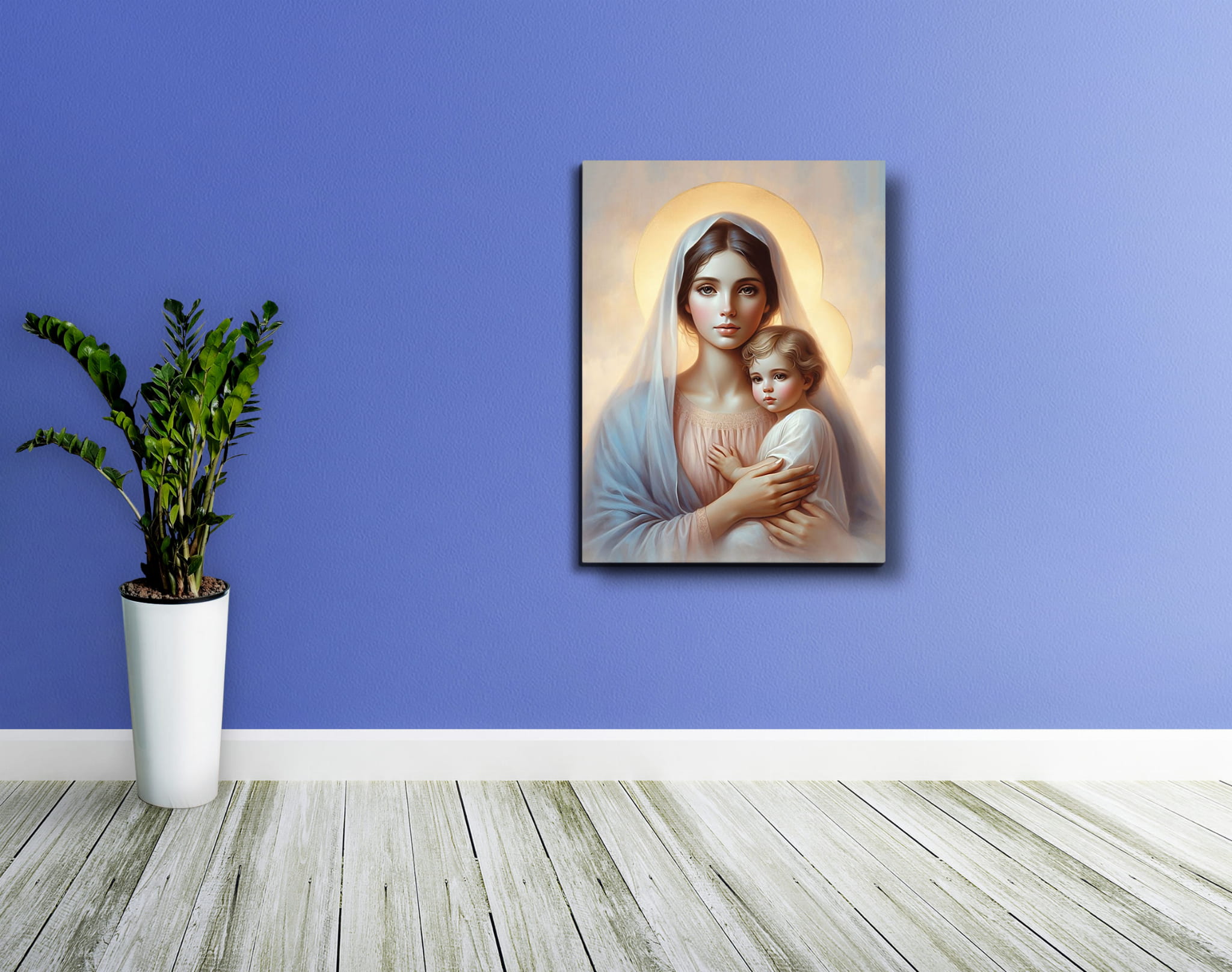 Wyjątkowy produkt przedstawiający wizerunek Matki Bożej z Dzieciątkiem Jezus. Obraz wykonany na wysokiej jakości płótnie.