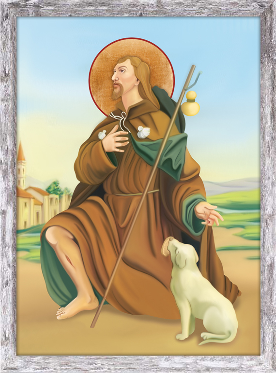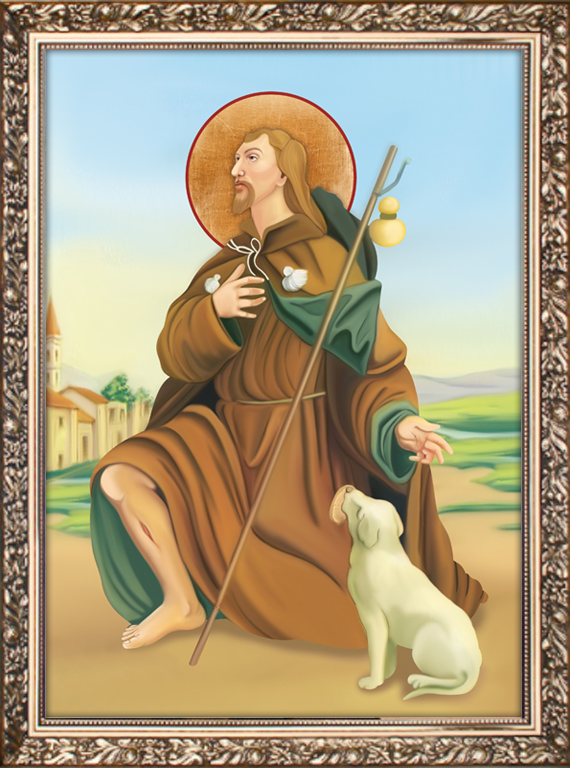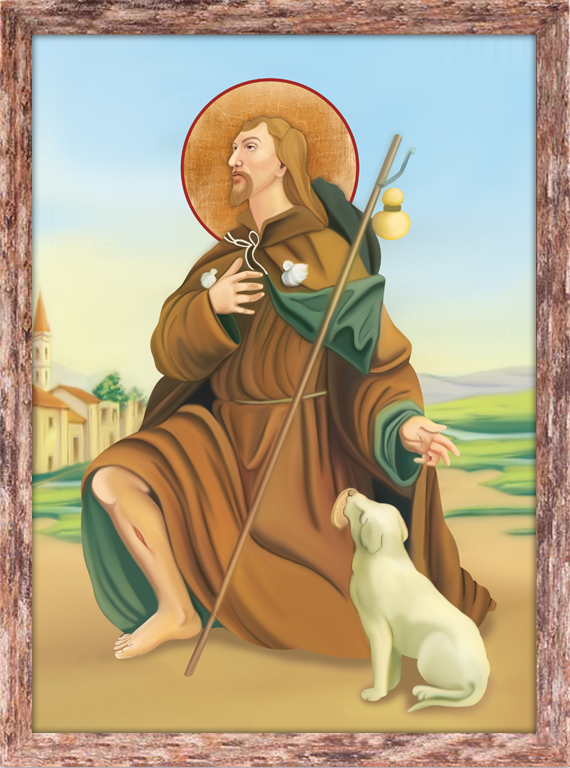 Święty Roch urodził się we Francji, pochodził z zamożnej rodziny. W wieku 19 lat nieszczęśliwie stracił oboje rodziców, wtedy też postanowił porzucić majątek i pieszo udać się do Rzymu. Po drodze natknął się na epidemię dżumy, niewiele się zastanawiając i martwiąc o własne zdrowie zdecydował się zostać i pomóc chorym. Aby docenić szlachetność, heroizm i bezinteresowność Świętego Rocha, Bóg obdarzył go łaską uzdrawiania.W czasie podróży został uznany za szpiega, zmarł w lochu po pięciu latach więzienia. Święty Roch jest patronem Parmy, Wenecji, aptekarzy, lekarzy, ogrodników, rolników. Jest także opiekunem zwierząt domowych.