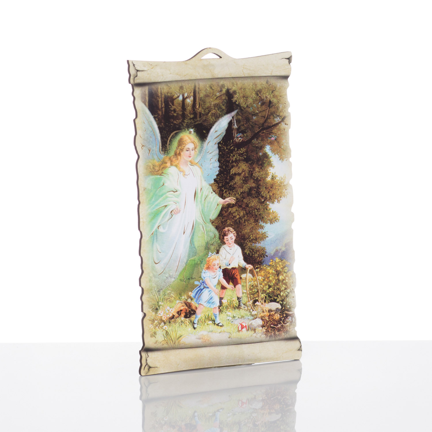Wyjątkowej jakości drewniany obrazek z wizerunkiem Anioła Stróża. Kolory i grafika artykułu subtelnie podkreślają każdy szczegół postaci. Produkt wykonany z wysokiej jakości materiału drewnopochodnego, którego solidna forma urzeknie każdego. Obrazek święty Anioł Stróż charakteryzuje się wspaniałym złoceniem, które akcentuje poszczególne detale kompozycji. Powyższy produkt sprawdzi się jako miły upominek, który w subtelny sposób zaakcentuje wiarę.