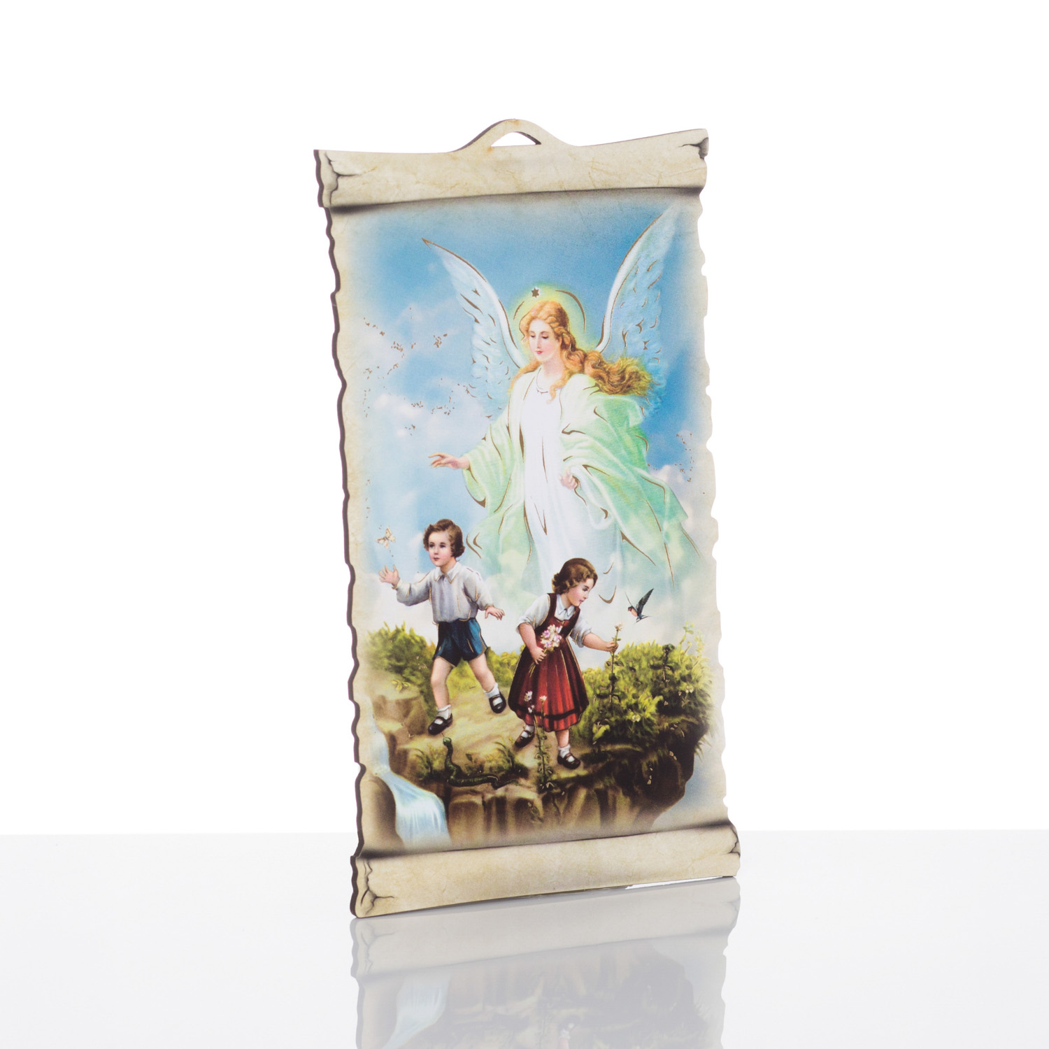 Wyjątkowej jakości drewniany obrazek z wizerunkiem Anioła Stróża. Kolory i grafika artykułu subtelnie podkreślają każdy szczegół postaci. Produkt wykonany z wysokiej jakości materiału drewnopochodnego, którego solidna forma urzeknie każdego. Obrazek święty Anioł Stróż charakteryzuje się wspaniałym złoceniem, które akcentuje poszczególne detale kompozycji. Powyższy produkt sprawdzi się jako miły upominek, który w subtelny sposób zaakcentuje wiarę.