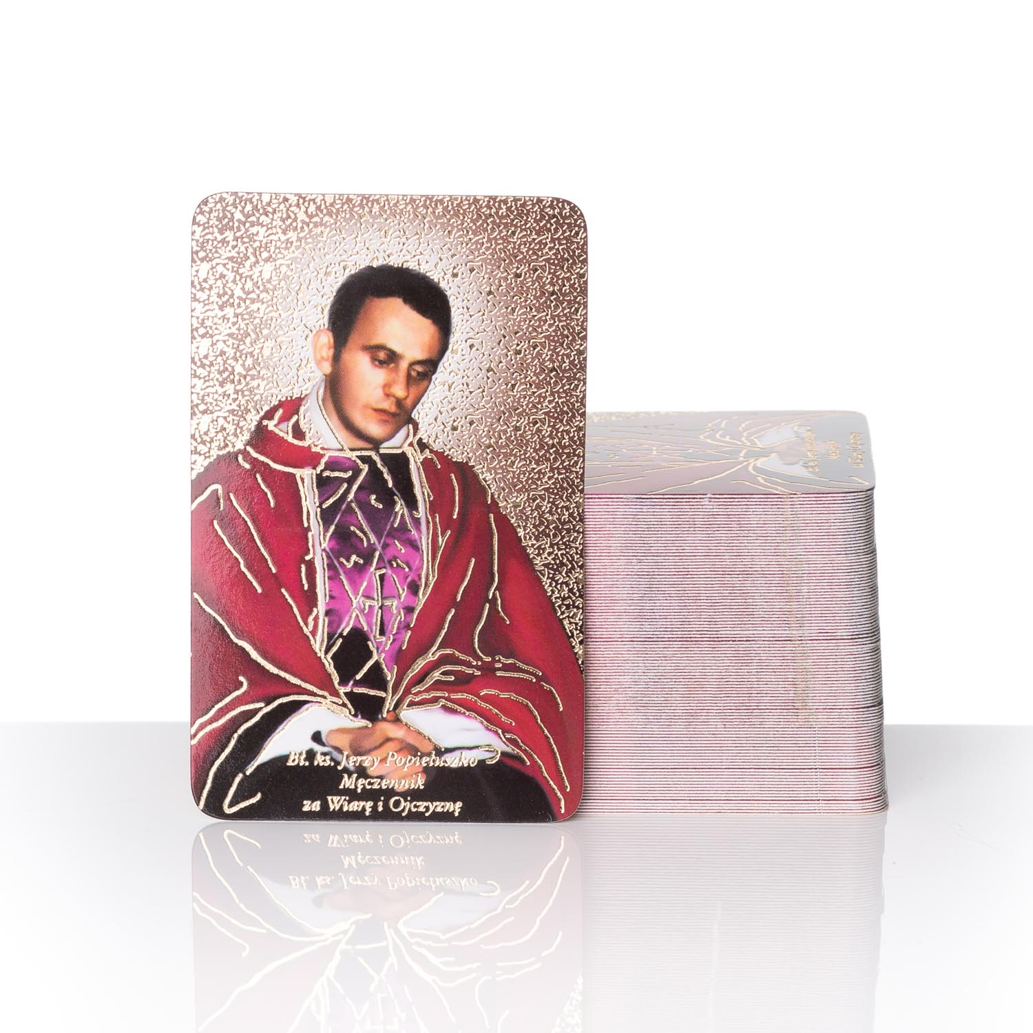 Wyjątkowej jakości obrazki święte z serii "modlitwa w drodze" z wizerunkiem Błogosławionego Księdza Jerzego Popiełuszki. Błogosławiony Ksiądz Jerzy Popiełuszko był niezwykła postacią Kościoła Katolickiego, w czasach niepokoju odważnie walczył o wolność i prawa Polaków. Na odwrocie obrazków świętych znajduje się modlitwa o łaski za wstawiennictwem Błogosławionego Księdza Jerzego Popiełuszki. Rysunek religijny znajdujący się na obrazkach świętych "modlitwa w drodze" wykonany jest z największą starannością, wyzłocony folią złotą oraz zabezpieczony laminatem.