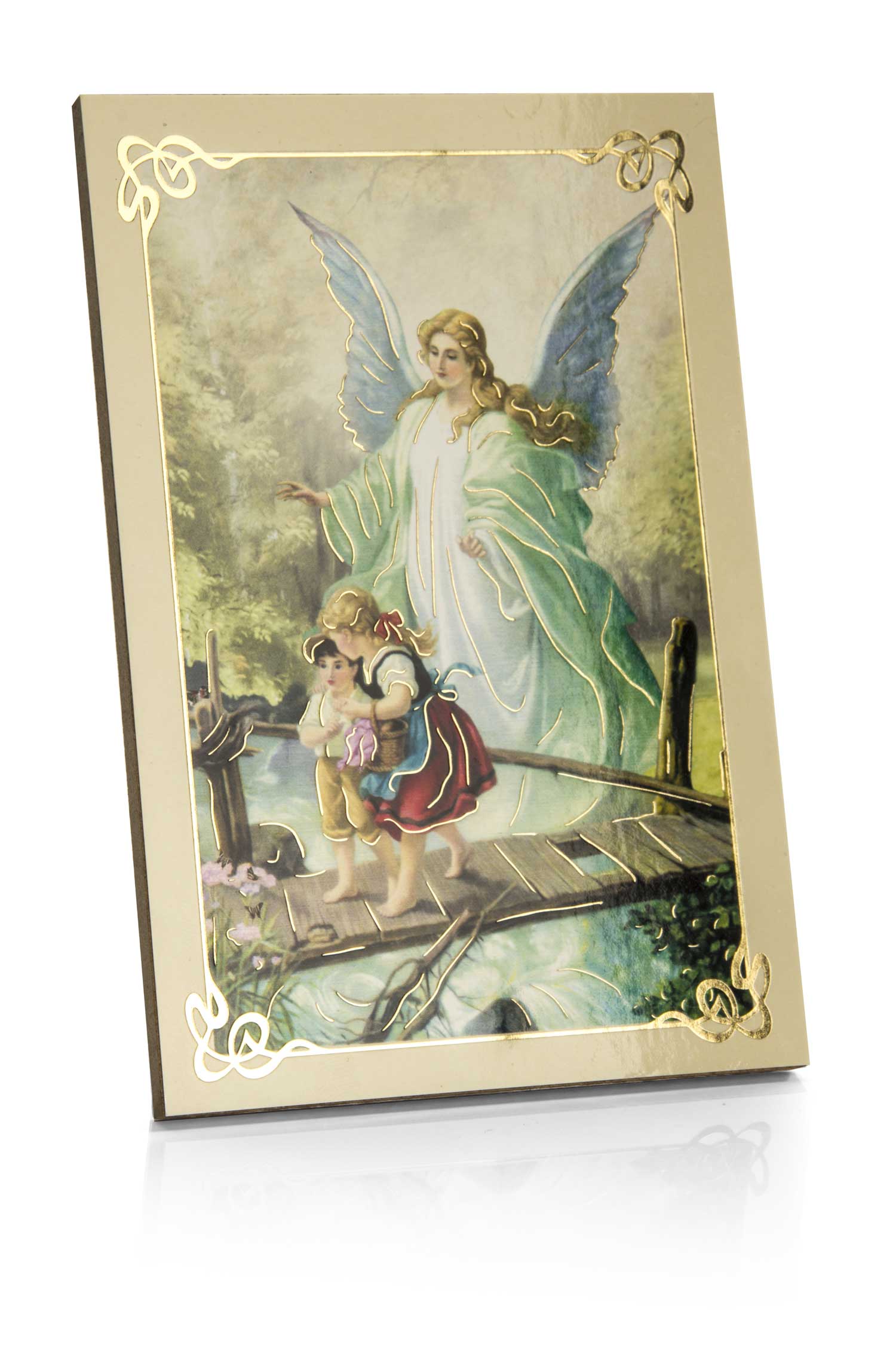 Obrazek drewniany ze wspaniałym motywem Anioła Stróża. Wyjątkowa grafika podkreślająca każdy szczegół postaci - Anioła Stróża oraz spacerujących dzieci. Obecność niebiańskiej istoty w pobliżu bawiącego się dziecka podkreśla powinność przypisaną Aniołom- opiece nad człowiekiem w każdym momencie jego życia. Produkt charakteryzuje się pięknym złoceniem i delikatną formą. Obrazek wykonany z wysokiej jakości materiału drewnopochodnego to wyjątkowy produkt, który wspaniale zaprezentuje się w każdym wnętrzu, oraz w subtelny sposób zaakcentuje wiarę.