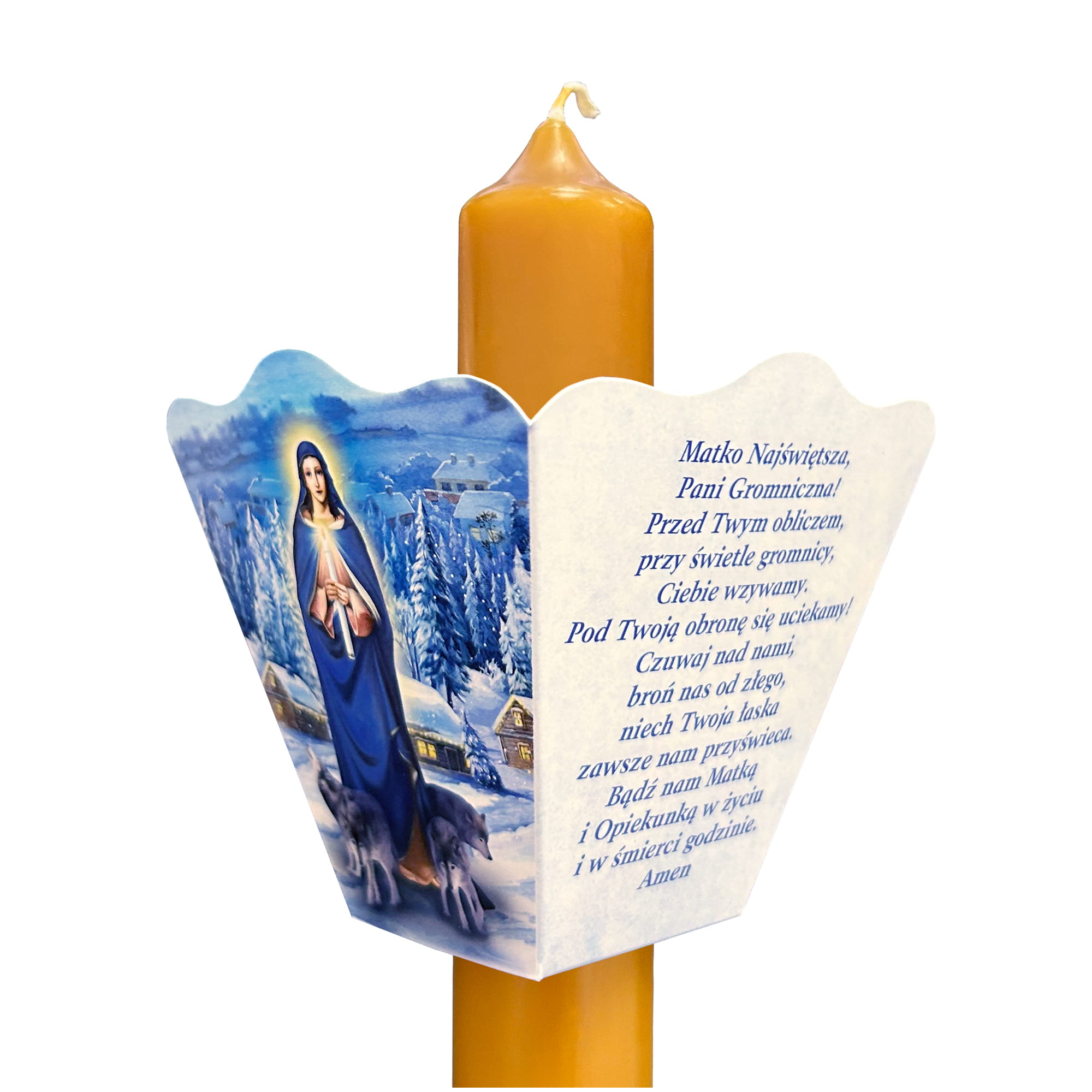 Okapnik posiada religijną grafikę oraz modlitwę, co nadaje mu szczególny, duchowy charakter. Idealnie sprawdzi się podczas Święta Ofiarowania Pańskiego (Matki Bożej Gromnicznej), a także w czasie modlitwy domowej i uroczystości kościelnych.