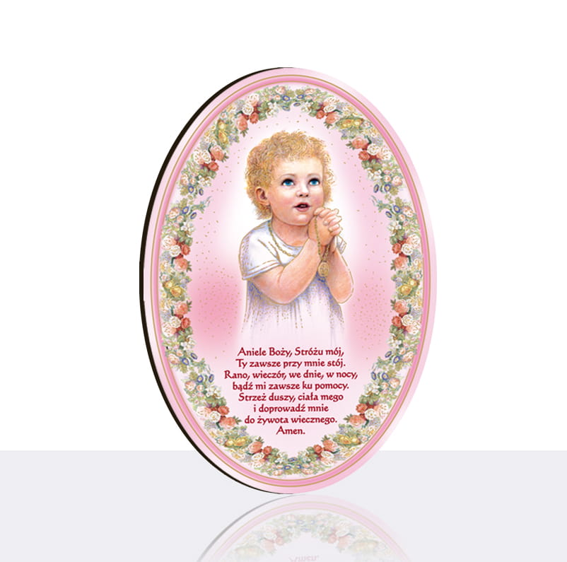 Obrazek religijny z Aniołem Stróżem. Na produkcie znajduje się modlitwa do Anioła Stróża. Obrazek wykonany jest na drewnopodobnym materiale HDF, wycinany laserem. Całość obrazka tworzy wspaniałą kompozycję, która wspaniale sprawdzi się jako upominek dla dziecka i element dekoracyjny do pokoju pociechy.