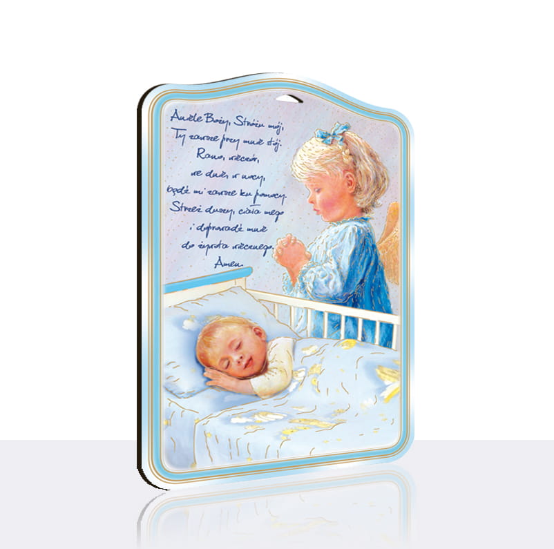Obrazek religijny z Aniołem Stróżem i śpiącym dzieckiem. Na produkcie znajduje się modlitwa do Anioła Stróża. Obrazek wykonany jest na drewnopodobnym materiale HDF, wycinany laserem. Całość obrazka tworzy wspaniałą kompozycję, która wspaniale sprawdzi się jako upominek dla dziecka i element dekoracyjny do pokoju pociechy.