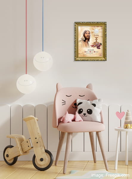Na obrazku komunijnym znajduje się wizerunek Jezusa Chrystusa. Obok Syna Bożego znajdują się symbole związane z Sakramentem Eucharystii. Pamiątka Pierwszej Komunii Świętej w formie obrazka w ramce z pełną personalizacją stanowi wyjątkowe podkreślenie i zaakcentowanie tego wyjątkowego wydarzenia w życiu każdego chrześcijanina. Każdy obrazek charakteryzuje się piękną grafiką i złoceniem.