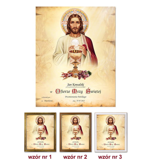 Przyjęcie Sakramentu I Komunii Świętej to bardzo ważne wydarzenie dla każdego dziecka. Najczęściej wybieraną formą Pamiątki Pierwszej Komunii Świętej stanowią obrazki komunijne. Umieszczone są na nich najważniejsze informację: imię i nazwisko dziecka przystępującego do sakramentu, data przyjęcia pierwszej komunii świętej, miejsce uroczystości, podpis księdza udzielającego sakramentu i pieczątka parafii. W naszej ofercie posiadamy obrazki komunijne charakteryzujące się różnorodną grafiką. W ofercie znajdą Państwo produkty przedstawiające Jezusa Chrystusa z Hostią, Jezusa Dobrego Pasterza, Najświętsze Serce Jezusa Chrystusa, Jezu Ufam Tobie oraz sceny biblijne m.in Ostatnia Wieczerza. Obrazki komunijne w ramce z pełną personalizacją wręczane są podczas nabożeństwa Pierwszej Komunii Świętej. Różnorodne wzory i formy wykończenia sprawiają, że z łatwością można wybrać produkt, który idealnie podkreśli uroczystość Pierwszej Komunii Świętej.
