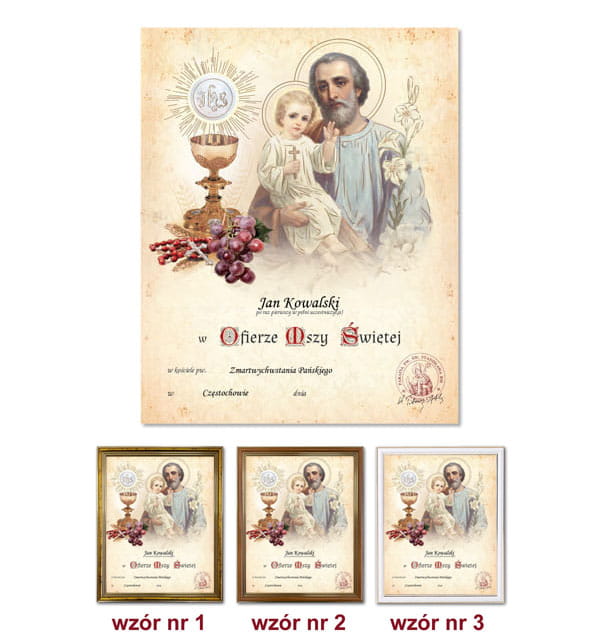 Na obrazku komunijnym znajduje się wizerunek Świętego Józefa - opiekuna Świętej Rodziny, którego czyny i postępowanie cechowało wielkie miłosierdzie oraz wiara. Pamiątka Pierwszej Komunii Świętej w formie obrazka w ramce z pełną personalizacją stanowi wyjątkowe podkreślenie i zaakcentowanie tego wyjątkowego wydarzenia w życiu każdego chrześcijanina. Każdy obrazek charakteryzuje się piękną grafiką i złoceniem.