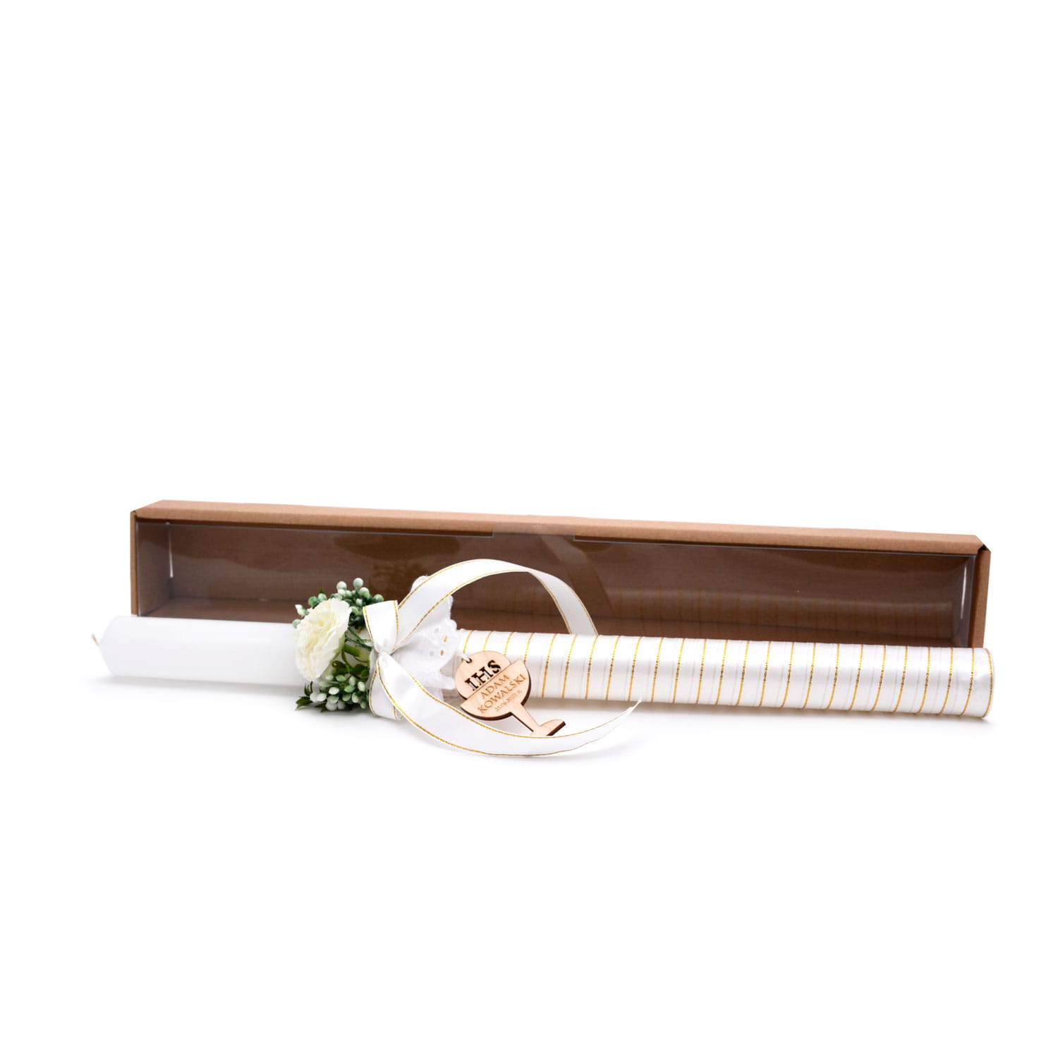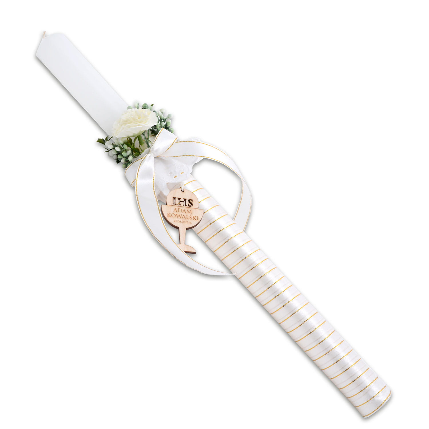 Wspaniała świeca, ręcznie zdobiona subtelnymi dodatkami. Przy białej profitce piękne kwiatuszki oraz drewniany symbol IHS kielich na którym są wygrawerowane dane dziecka pierwszokomunijnego i data komunii. Całość bardzo ładnie się komponuje.