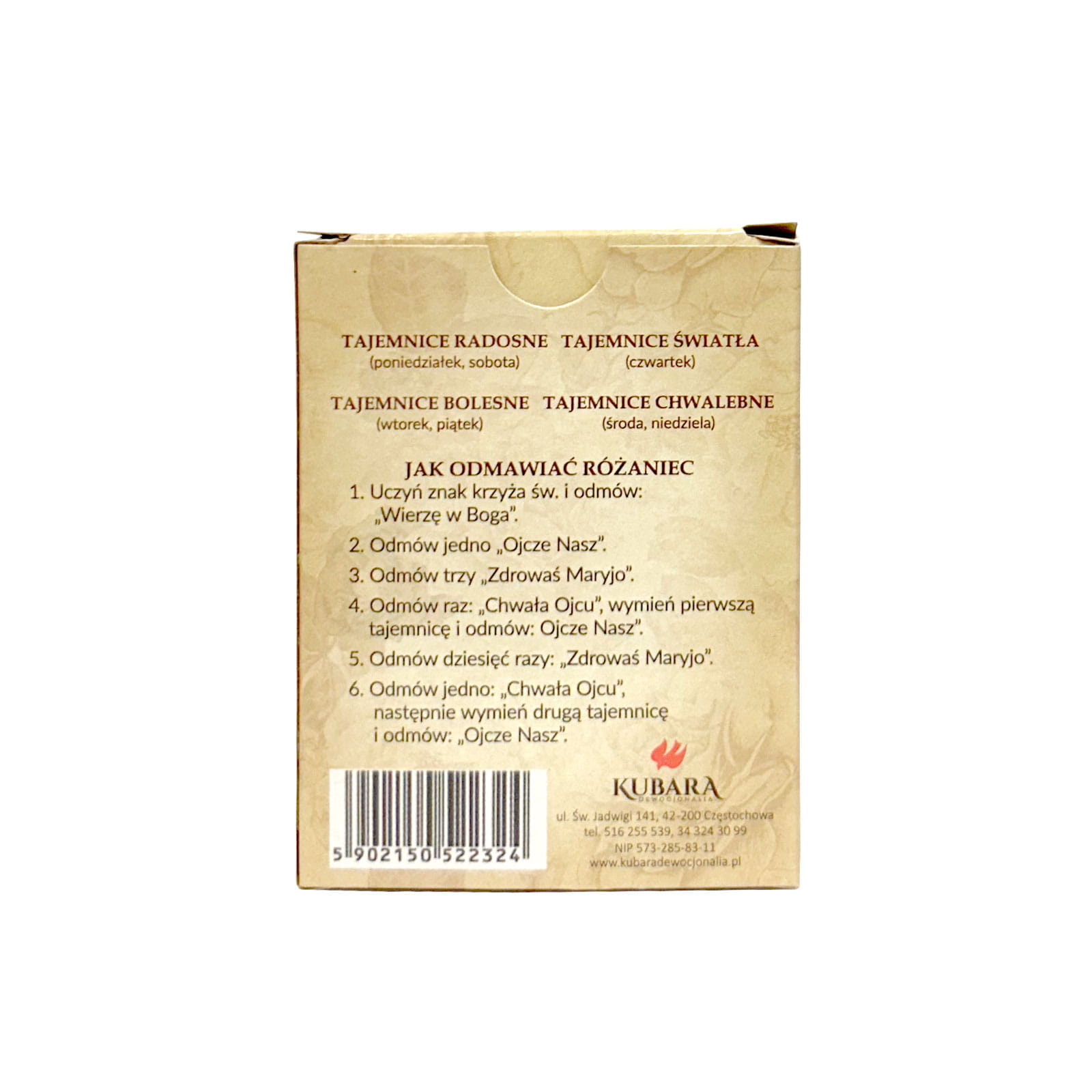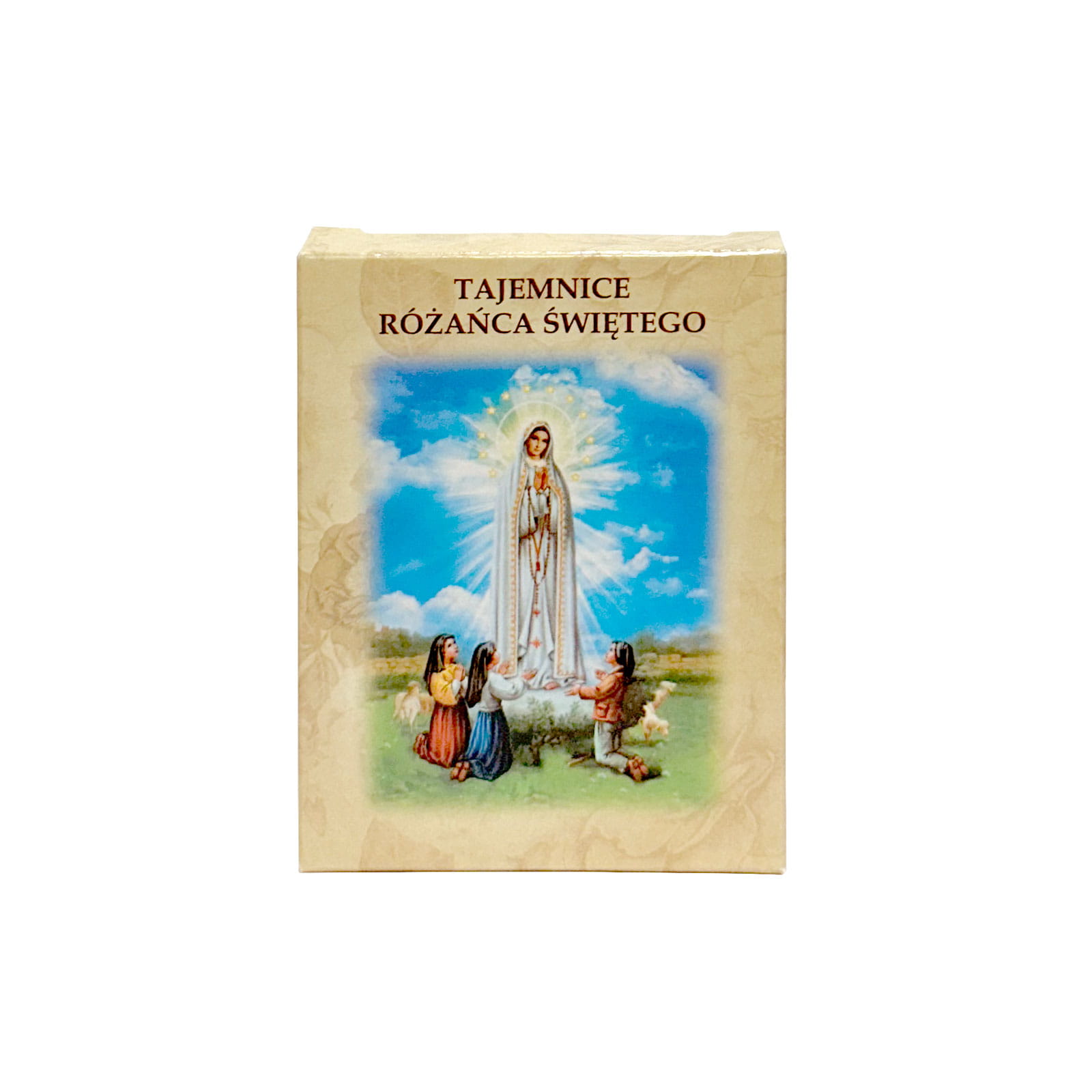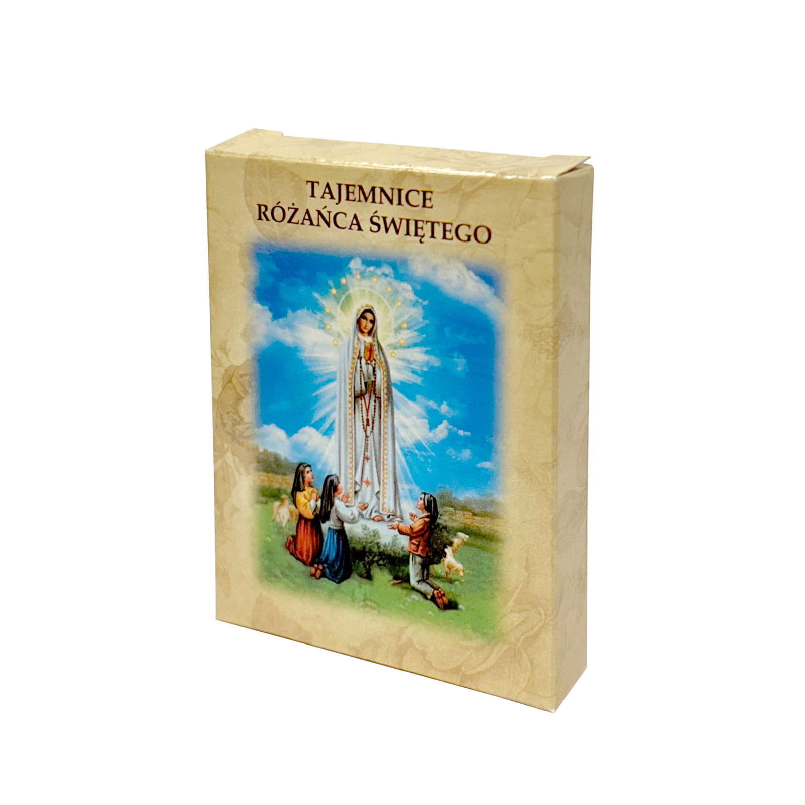 W paczce znajdują się karty zawierające obrazki dotyczące Tajemnic Różańca Świętego. Na kartach znajdują się cytaty z Nowego Testamentu oraz modlitwy odmawiane przy kolejnych Tajemnicach Różańca Świętego. W opakowaniu jest łącznie 20 kart (po jednej na Tajemnicę).
