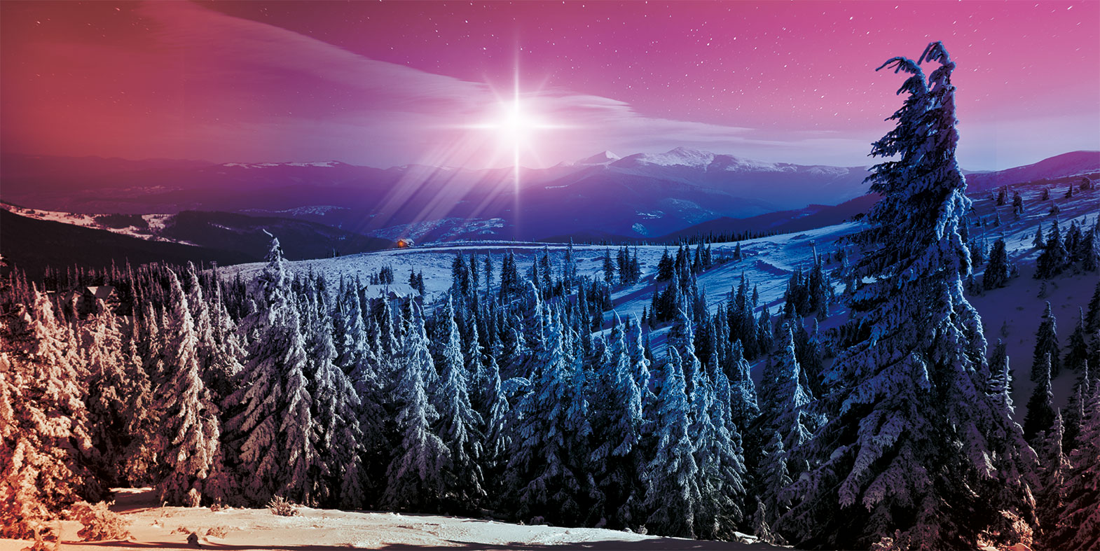 Baner przedstawia Gwiazdę Betlejemską na "różowym niebie" rzucająca swe promienie na chatkę umiejscowioną tuż przy lesie. Piękny krajobraz przedstawia zimową aurę. Baner wykonany na wysokiej jakości materiale, materiał odporny na różne warunki atmosferyczne. Baner przeznaczony jest do ekspozycji wewnętrznej oraz zewnętrznej.