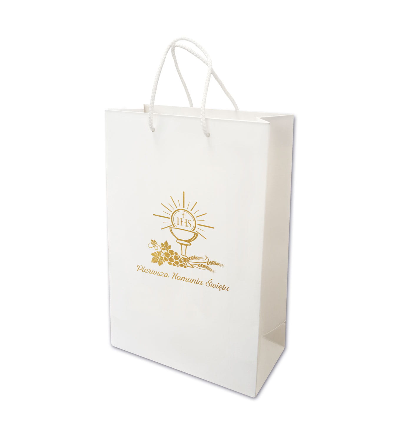 Nasz nowy produkt który idealnie sprawdzi się na uroczystość Pierwszej Komunii Świętej. Torba prezentowa charakteryzuje się delikatnym, białym odcieniem oraz złoconym zdobieniem. Na produkcie znajduje się napis "IHS Pierwsza Komunia Święta."