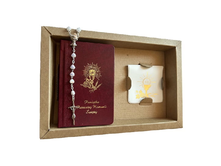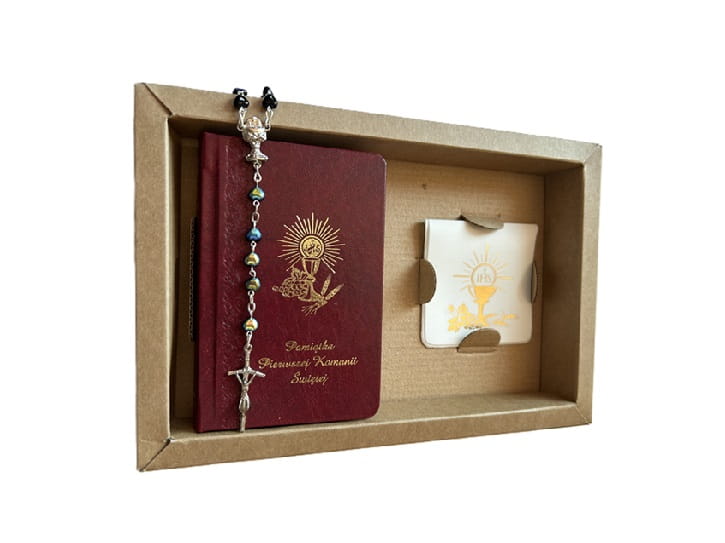 Wysokiej jakości zestaw, który składa się z  różańca w kształcie serduszka, złoconego etui oraz książeczki pierwszokomunijnej.
